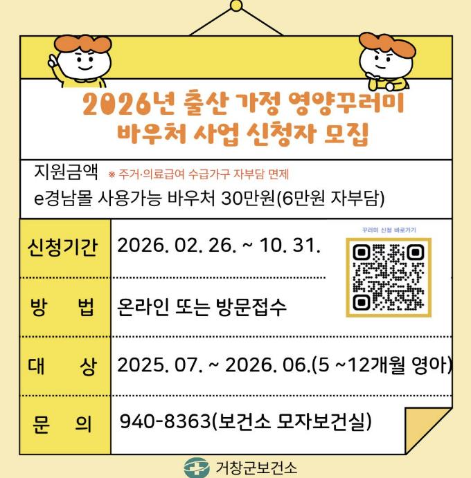 [파이낸셜경제=김예빈 기자] 거창군은 관내 영아의 건강한 발달과 출산 가정의 경제적 부담을 경감하기 위해 26일부터 ‘출산 가정 영양꾸러미 바우처 지원사업’ 신청을 받는다고 밝혔다.
