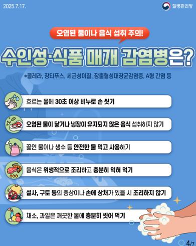 시 관계자는 “여름철 집중호우 기간에는 감염병 예방을 위한 철저한 위생관리가 무엇보다 중요하다”며 “시민들께서는 손 씻기 등 기본적인 예방수칙을 반드시 실천해주시기 바란다”고 강조했다.