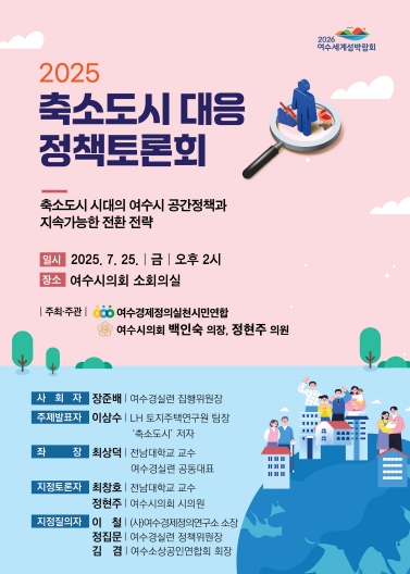 이번 토론회는 여수시의회와 여수경제정의실천시민연합(이하 ‘여수경실련’)이 공동 주최하며, 인구감소와 초고령사회, 생활권 공동화 등 도시 구조의 급격한 변화에 대응해 ‘축소도시 전략’이라는 새로운 도시계획 패러다임을 모색하기 위해 마련됐다.