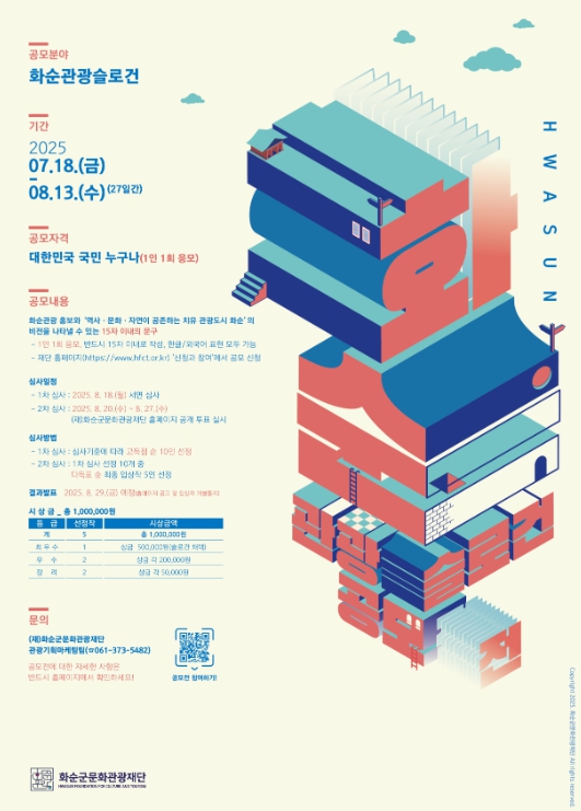 [파이낸셜경제=김예빈 기자] (재)화순군문화관광재단는 ‘역사·문화·자연이 공존하는 치유관광도시 화순’이라는 비전을 널리 알리고, 2025년 화순 관광객 500만 시대를 향한 첫걸음을 내딛기 위해 관광 슬로건 공모전을 개최한다.