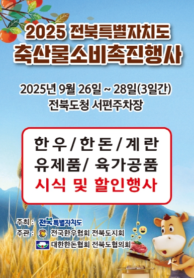 [파이낸셜경제=김예빈 기자] 전북특별자치도가 추석 명절을 맞아 도민들에게 안전하고 품질 좋은 축산물을 저렴하게 제공하기 위해 ‘2025년 축산물 소비촉진행사’를 연다. 도는 이번 행사를 9월 26일부터 28일까지 사흘간 도청 서편광장에서 개최한다고 23일 밝혔다.