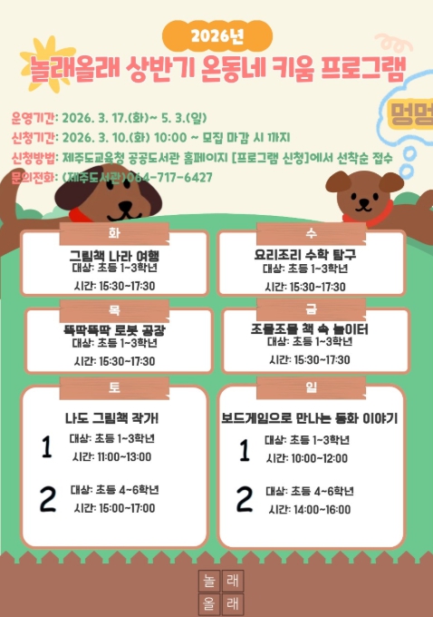 [파이낸셜경제=김영란 기자] 제주도교육청 제주도서관은 도내 초등학생들의 알찬 방과 후와 주말 활동을 지원하기 위해 2026년 상반기 주중·주말 온동네 키움 프로그램’을 본격 운영한다.