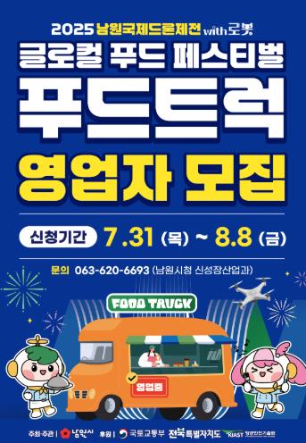[파이낸셜경제=김예빈 기자] 남원시는 오는 10월 16일부터 19일까지 개최하는 ‘2025 남원국제드론제전 with 로봇’의 성공적인 운영과 관람객 편의를 위해 ‘글로컬 푸드 페스티벌’ 푸드트럭 영업자를 공개 모집한다.