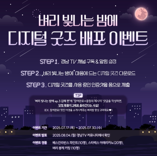 한편, 경남도는 지난 5월부터 야경 명소와 음악을 결합한 콘텐츠 ‘벼리 빛나는 밤에’를 유튜브 채널을 통해 공개하고 있다. 이 콘텐츠와 연계해, 밀양·창원·김해의 야경 명소를 배경으로 한 디지털 굿즈도 7월 17일부터 함께 배포 중이며, 배경화면을 인증하면 경품을 받을 수 있는 참여형 이벤트도 진행된다.