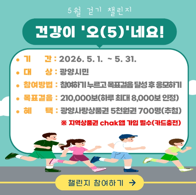 [파이낸셜경제=김예빈 기자] 광양시는 오는 5월 1일부터 5월 31일까지 모바일 걷기 앱 워크온을 활용한 ‘건강이 오(5)네요! 5월 걷기 챌린지’를 운영한다고 24일 밝혔다.
