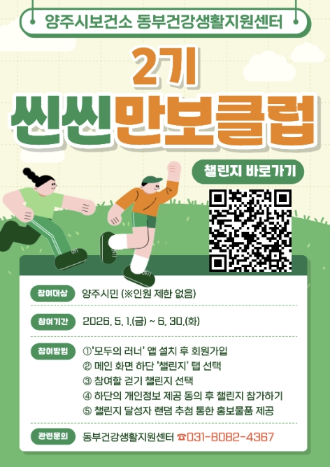 [파이낸셜경제=김기보 기자] 양주시보건소 동부 건강생활지원센터에서 지역 주민의 건강생활실천율 향상과 비만율 개선을 위해 ‘2026년도 씬씬 만보클럽 2기’ 참여자를 모집한다.