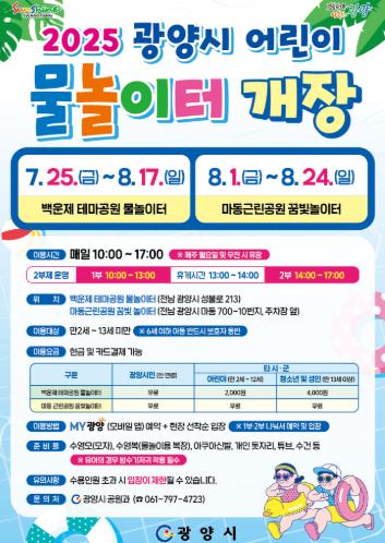 정현숙 광양시 공원과장은 “올해는 신규 물놀이터를 조성해 아이들이 즐길 수 있는 공간을 넓히고, 지난해 운영 과정에서 나온 다양한 개선사항도 반영했다”며 “온 가족이 함께 즐기며 안전하고 시원한 여름을 보내시길 바란다”고 말했다.