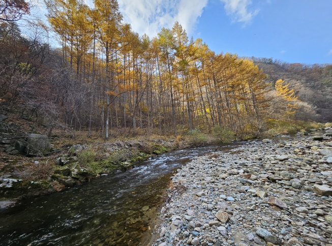 여름과 가을의 정취가 공존하는 육송정 삼거리 물놀이장은 단풍나무로 둘러싸여 한 폭의 수채화를 연상케 한다. 특히 10월경이면 노란 단풍이 계곡 물 위로 비쳐 환상적인 풍경을 자아낸다. 매년 500명 이상의 주민과 관광객이 찾아와 피서를 즐기며, 넓은 주차공간과 간이화장실 등 편의시설도 갖춰져 있다. 사진 속 짙은 단풍빛이 어우러지는 이곳은 석포면이 자랑하는 여름, 가을철 가족 물놀이 명소로 손꼽힌다.