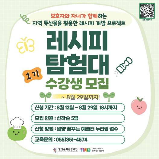 [파이낸셜경제=김예빈 기자] 밀양문화관광재단(이사장 안병구)은 12일부터 29일까지 지역 특산물을 활용한 가족 단위 융합형 문화예술교육 프로그램 ‘레시피 탐험대’ 참가자를 모집한다고 11일 밝혔다.
