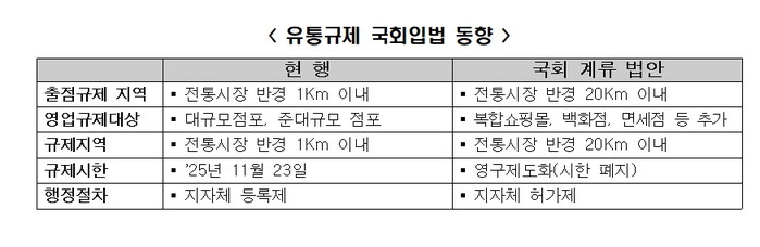 그럼에도 우리나라 국회에서는 출점규제와 영업규제를 강화하는 유통산업발전법 개정안이 소관 상임위원회에서 통과를 기다리고 있다. 지자체장은 전통시장 반경 1Km 이내에서 전통시장보존구역을 지정해서 대규모점포 연면적 3,000m2 이상으로 상시 운영되는 매장으로 대형마트, 백화점, 복합쇼핑몰 등이 해당와 준대규모점포 대형마트 운영 회사 또는 계열사가 운영하는 직영 및 체인 점포 또는 상호출자제한집단 계열사가 운영하는 직영 및 체인 점포 중 산업분류상 슈퍼마켓에 해당하는 점포 등의 출점을 제한할 수 있는데, 전통시장보존구역을 전통시장 반경 20Km 까지 확대하는 법안이 계류 중이다.