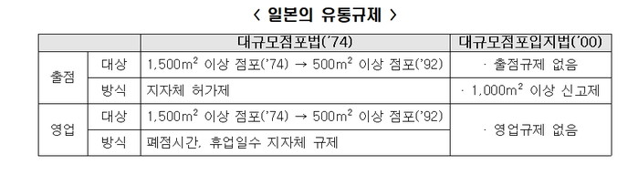 일본은 ’74년 이후 대규모점포법을 시행하면서 지자체가 대규모점포 1,500m2 이상 점포(’74) → 500m2 이상 점포(’92)의 출점여부를 허가했고, 영업시간과 휴업 일수도 규제했다.