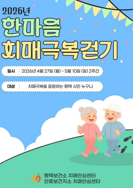 [파이낸셜경제=김기보 기자] 평택보건소 치매안심센터와 안중보건지소 치매안심센터에서는 지역 주민의 치매 예방과 인식개선을 위해 녪년 한마음 치매극복 걷기 행사’를 오는 4월 27일부터 5월 10일까지 2주간 진행한다.
