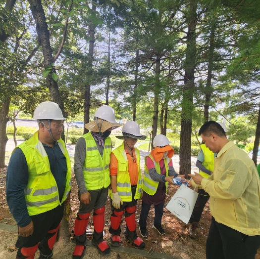| ▲ 시 관계자가 옥외 현업근로자를 찾아 폭염대비 행동 요령을 안내하고 쿨토시 등 온열질환 예방물품을 전달하고 있다 |