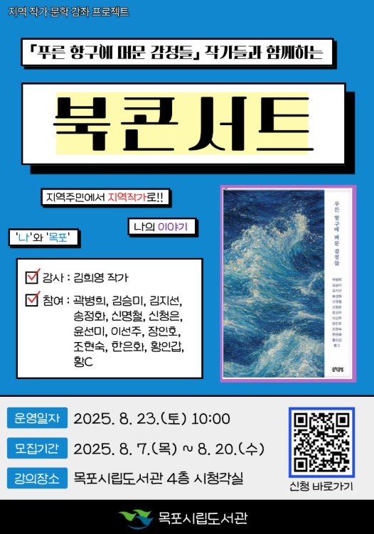 [파이낸셜경제=김예빈 기자] 목포시립도서관은 오는 8월 23일 오전 10시, 시립도서관 시청각실에서 '푸른 항구에 머문 감정들' 북콘서트를 개최한다.