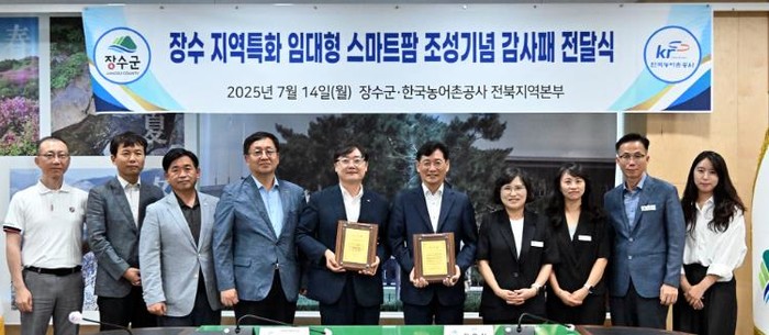 [파이낸셜경제=김예빈 기자] 장수군은 14일 군청 회의실에서 ‘장수군 지역특화 임대형 스마트팜’ 조성을 기념하며 한국농어촌공사 전북지역본부와 감사패를 상호 전달했다고 밝혔다.