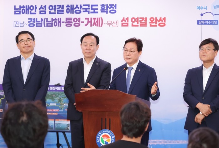 박완수 도지사는 10일 도청 프레스센터에서 열린 브리핑에서 “남해안 주요 섬과 섬을 잇는 해상국도 건설의 밑그림이 완성된 셈”이라며, “이번 국도 지정으로 신남해(창선)대교, 사량대교, 신통영대교, 한산대첩교, 해금강대교 등 총 5개의 해상교량 건설이 가능해졌다”고 밝혔다. 또 “이제는 남해~통영~부산을 막힘없이 연결하는 해상국도를 현실로 만들 수 있게 됐다”며 “앞으로 남해안을 동북아시아 해양 관광의 구심점으로 거듭나게 할 남해안 섬 연결 해상 국도 구축의 조속한 완료를 위해 최선의 노력을 다하겠다”고 말했다.