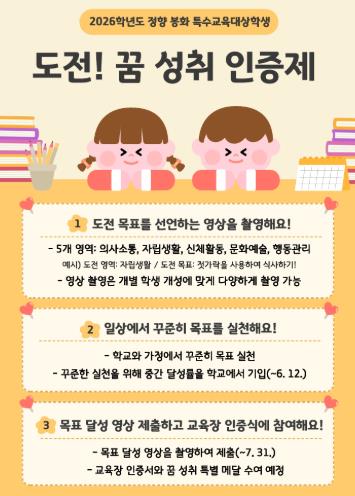 [파이낸셜경제=김지훈 기자] 봉화교육지원청은 4월 20일 '장애인의 날'을 기념하여, 경상북도 내 최초로 특수교육대상학생의 특성을 반영해 전면 개편한 2026학년도 정향 봉화 특수교육대상학생 '도전! 꿈 성취 인증제' 참가 신청을 받고 본격적인 운영에 돌입한다고 밝혔다.