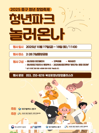 [파이낸셜경제=김지훈 기자] 대구 중구는 청년창업가와 지역 주민이 함께 어울릴 수 있는 교류의 장을 마련하고자 2025년 중구 청년창업 축제 '청년파크 : 놀러온나'를 오는 10월 17일부터 18일까지 양일간 2·28기념중앙공원에서 개최한다고 밝혔다.