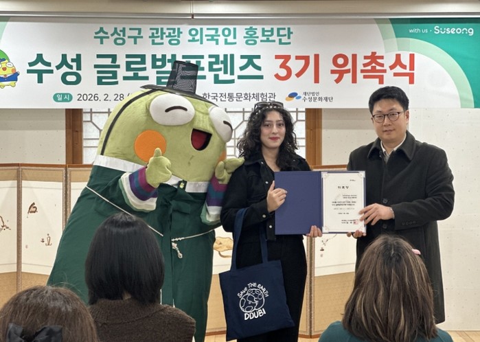 [파이낸셜경제=김지훈 기자] 대구 수성문화재단(이사장 김대권)은 지난달 28일 한국전통문화체험관에서 수성구 관광 외국인 홍보단 ‘수성 글로벌 프렌즈 3기’를 위촉했다고 밝혔다.