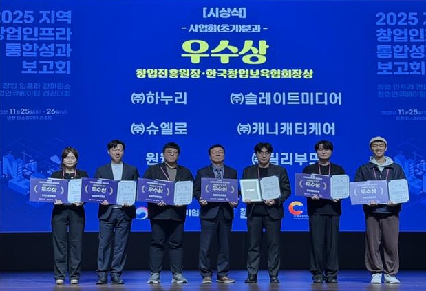 [파이낸셜경제=김지훈 기자] 대구 수성구는 지난 25일 인천 인스파이어 리조트에서 열린 ‘2025년 지역 창업 인프라 통합 성과보고회’에서 수성구 중장년 기술창업센터 입주기업 ㈜캐니캐티케어(대표 홍재우)가 ‘창업 인큐베이팅 경진대회’ 초기사업화 서비스분과에서 우수상(창업진흥원장상)을 수상했다고 밝혔다.