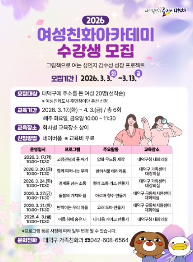 [파이낸셜경제=김영란 기자] 대전 대덕구는 오는 13일까지 ‘2026년 여성친화아카데미’ 수강생을 모집한다.