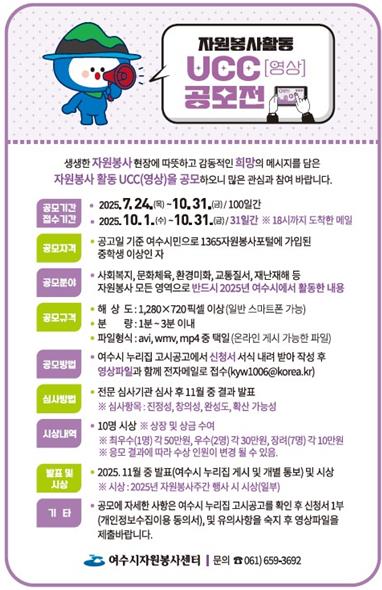 이번 공모는 여수 지역에서 2025년 활동한 내용을 영상으로 제작해 응모하는 방식으로 사회복지, 문화체육, 환경미화, 교통질서, 재난재해 등 자원봉사 모든 분야를 대상으로 한다.