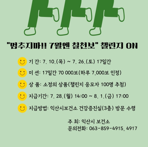 [파이낸셜경제=김예빈 기자] 익산시 보건소는 무더운 날씨 탓에 신체활동이 부족해지기 쉬운 여름철 주민들의 건강 관리를 위해 '멈추지마, 7월엔 칠천보' 챌린지를 운영한다고 11일 밝혔다.