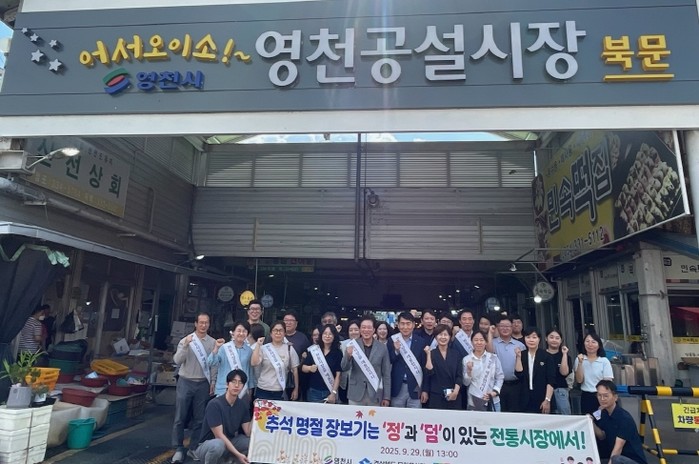▲ 지난 29일 추석맞이 전통시장 활력 장보기 행사에 참여한 영천시, 경북도 문화유산과, 경북문화재단 문화유산원 직원들이 영천공설시장 앞에서 기념촬영을 하고 있다. |