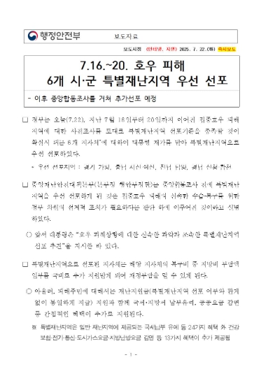 주민 생활 안정 대책도 넓어졌다. 일반 재난지역에서 제공되는 국세‧지방세 납부 유예 등 간접지원 항목도 24개 제도에 더해, 건강보험료·전기·통신·도시가스·지역난방 요금 감면 등 13개 항목이 추가 적용돼 모두 37개 항목의 지원을 받을 수 있다. 중소기업에 대한 국세·지방세는 최대 2년까지 납부 기한이 연장되고, 침수 차량·건축물의 취득세·자동차세도 면제된다.