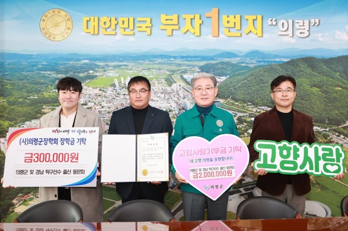 [파이낸셜경제=김예빈 기자] 의령군은 지난 1일 의령군과 경남 지역 탁구선수 출신들로 구성된 동문회가 고향사랑기부금과 (사)의령군장학회 후원금으로 총 230만원을 기탁했다고 밝혔다.