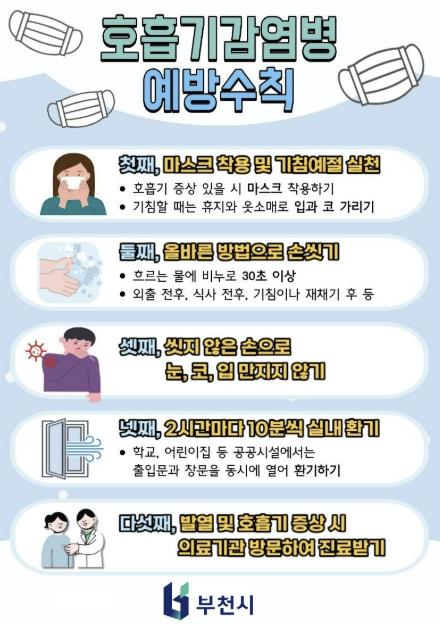 호흡기 감염병 예방을 위해서는 △비누를 사용해 30초 이상 손씻기 △기침 예절 지키기 △실내 자주 환기하기 △증상 있을 시 마스크 착용 등이 필요하다.
