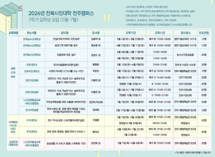 또한 MICE 산업과 연계한 지역특화학부에서는 △직무능력 향상을 위한 AI 활용-바이브코딩1 △테이블 퍼실리테이터 워크숍 △전주 역사문화 스토리텔러과정 △전주 문화 경제학 등이 마련된다.