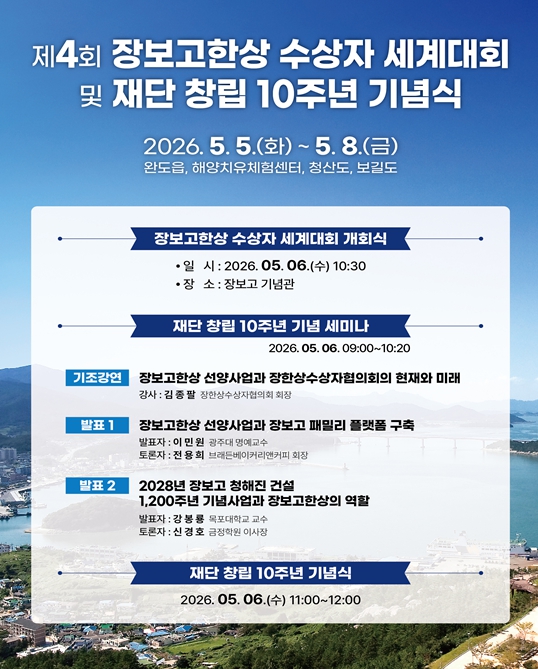 재단과 장한상수상자협의회는 청해진을 거점으로 동아시아 해상무역을 이끌었던 장보고 대사의 개척과 도전 정신을 계승, 발전시키며 전 세계 한상 네트워크 구축과 교류 활성화를 위해 2023년부터 인도네시아 자카르타와 오스트리아 비엔나, 미국 워싱턴-뉴욕 등에 이어 올해 제4회 장한상 수상자 세계대회를 완도에서 개최하게 됐다.