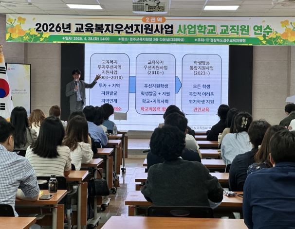 [파이낸셜경제=김지훈 기자] 경상북도경주교육지원청은 2026년 4월 28일 경주교육지원청 다온실(3층 대회의실)에서 ‘2026년 교육복지우선지원사업 2권역 사업학교 교직원 연수’를 개최했다.