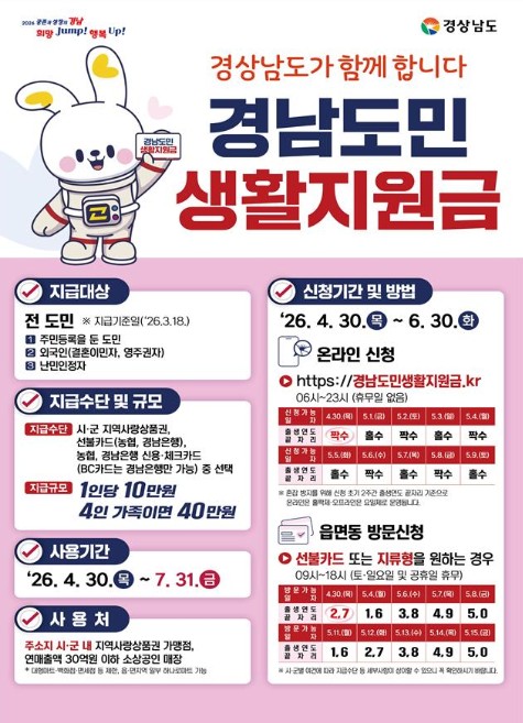지급 대상은 2026년 3월 18일 기준으로 경상남도에 주민등록을 두고 있는 도민으로, 신청기한인 6월 30일까지 태어난 출생아까지 포함된다. 외국인의 경우 영주권자(F-5), 결혼이민자(F-6), 난민인정자까지 포함해 수혜 범위를 넓혔다.
