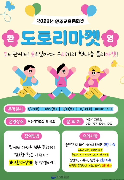 [파이낸셜경제=조성환 기자] 원주교육문화관은 4월 25일부터 책나눔 ‘도토리마켓’을 운영한다.