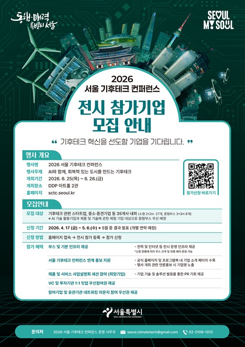 참여 신청은 ‘2026 서울 기후테크 컨퍼런스’ 누리집에서 가능하며, 전시 참여와 관계없이 투자 상담은 상시 접수한다. 최종 선정 결과는 5월 중 개별 통보되며, 자세한 내용은 누리집이나 운영 사무국을 통해 확인할 수 있다.