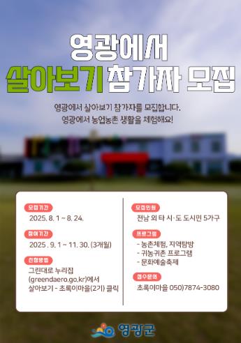 [파이낸셜경제=김예빈 기자] 영광군은 귀농·귀촌을 희망하는 도시민의 안정적인 농촌 정착을 지원하기 위해 '2025년 영광에서 살아보기' 2기 참가자를 모집한다.