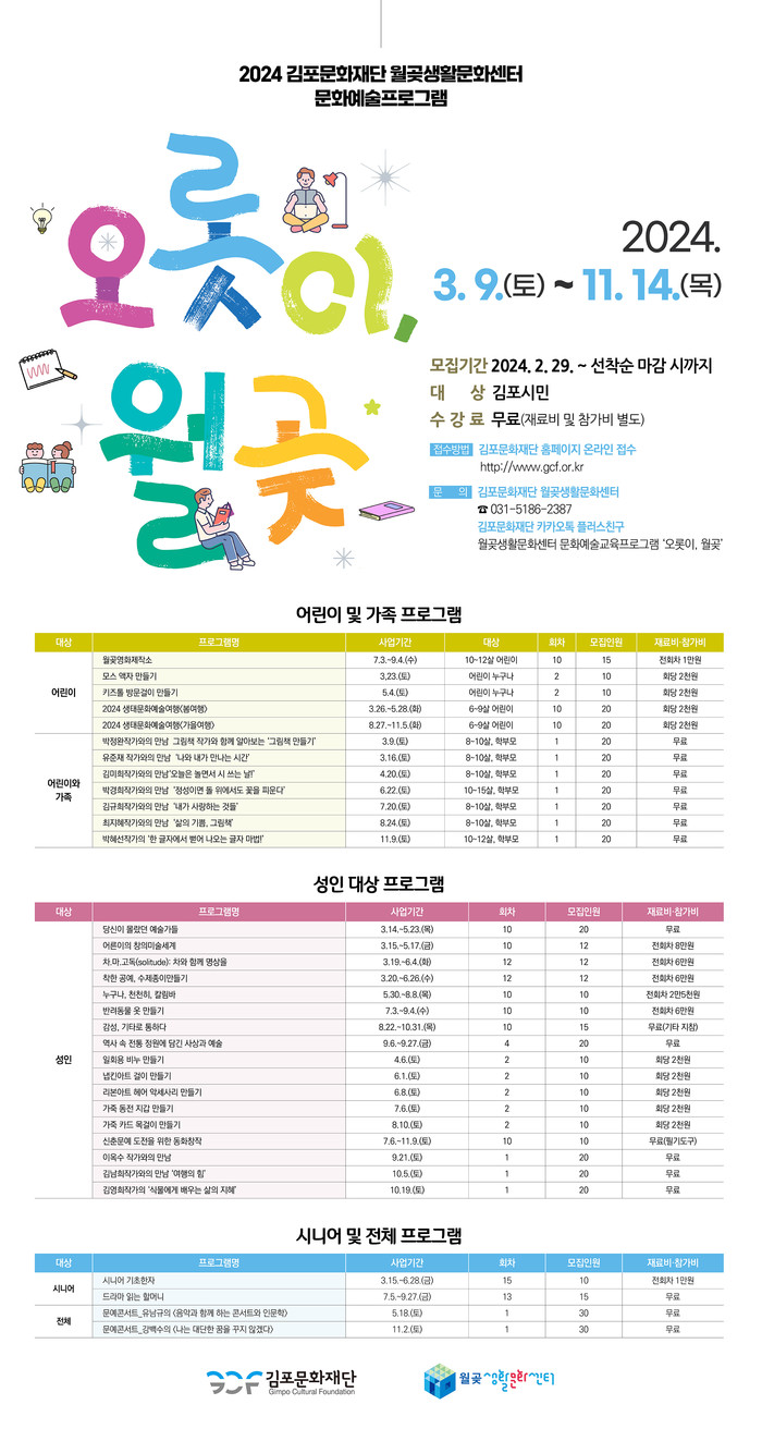 <오롯이, 월곶>의 세부 프로그램은 김포문화재단 누리집을 통해 확인할 수 있으며, 관련 문의는 월곶생활문화센터(031-983-2374 또는 031-5186-2387)로 하면 된다.