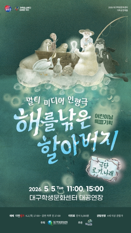 [파이낸셜경제=김지훈 기자] 대구학생문화센터는 어린이날을 맞아 어린이와 가족 관객을 위한 특별 기획공연 '멀티미디어 인형극 해를 낚은 할아버지'를 오는 5월 5일 대공연장에서 선보인다.