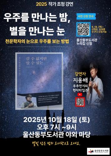 [파이낸셜경제=김예빈 기자] 울산 동부도서관은 오는 10월 18일 오후 7시 야외 잔디마당에서 천문학자이자 유튜브 1인 방송 진행자(크리에이터) 지웅배 작가의 초청 강연 ‘우주를 만나는 밤, 별을 만나는 눈’을 연다.