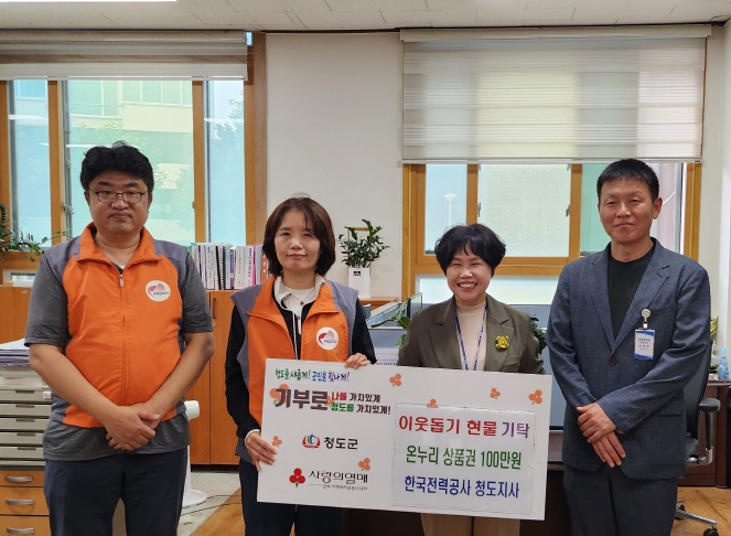 | ▲ 이웃을 위한 따뜻한 나눔의 실천 한국전력공사 청도지사, 온누리 상품권 100만원 기탁 |