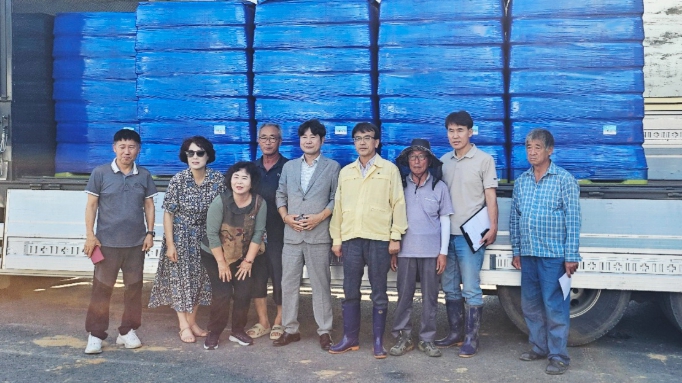 | ▲ (사)전국이통장연합회 거제시지회, 산청군 수해 피해 주민에게 생수 1,008박스 지원 |