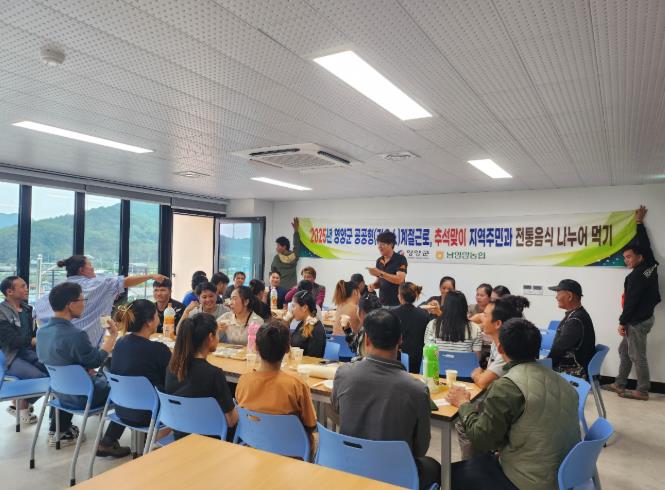 [파이낸셜경제=김지훈 기자] 남영양농협은 지난 10월 3일 영양군 농업근로자 기숙사에서 라오스 출신 공공형 계절근로자 30명과 지역주민이 함께하는‘추석맞이 전통음식 나누기' 행사를 가졌다.