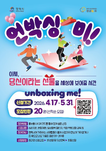 [파이낸셜경제=김기보 기자] 평택시 청년지원센터는 4월 17일부터 5월 31일까지 평택시에 거주하는 사회활동이 줄어 사람과의 만남이 거의 없거나 집 밖으로 나오기 힘든 청년의 일상 회복과 사회 참여 촉진을 위해 실시하는 지원사업 '언박싱 미!' 참여자를 모집한다.
