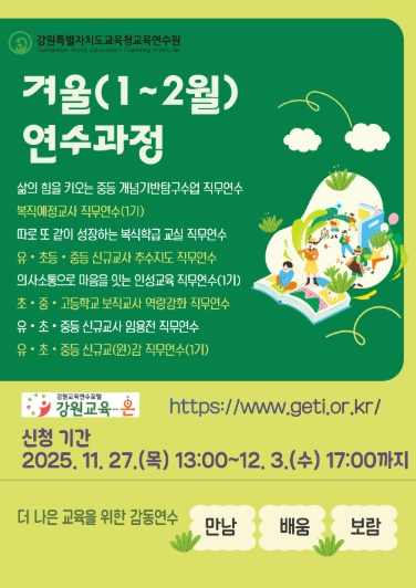 [파이낸셜경제=조성환 기자] 강원특별자치도교육청교육연수원은 11월 27일부터 12월 3일까지 2026년 겨울(1~2월) 연수 과정 신청을 진행한다.