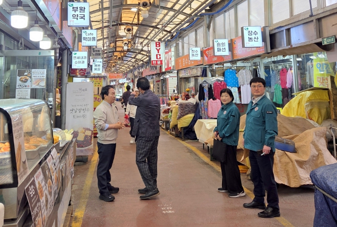 | ▲ 16일 오전 ‘시설물 집중 안전 점검’을 위해 관련 공무원 및 민간전문가와 함께 영천시장을 찾은 이성헌 서대문구청장 |