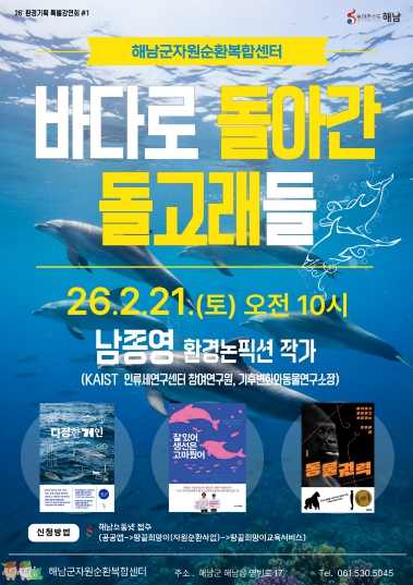 [파이낸셜경제=김예빈 기자] 해남군자원순환복합센터는 오는 21일 환경논픽션 작가 남종영을 초청해 ‘바다로 돌아간 돌고래들’특별강연을 개최한다.
