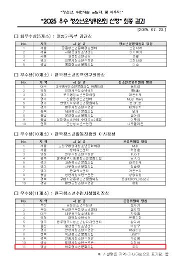 아주청소년문화의집 청소년운영위원회 담당자는 “청소년 스스로가 책임감을 가지고 자치활동을 이끌어온 결과가 전국적으로 인정받아 매우 뜻깊다”며, “앞으로도 청소년의 목소리가 반영되는 참여 문화가 더욱 확산될 수 있도록 적극 지원할 것”이라고 밝혔다.