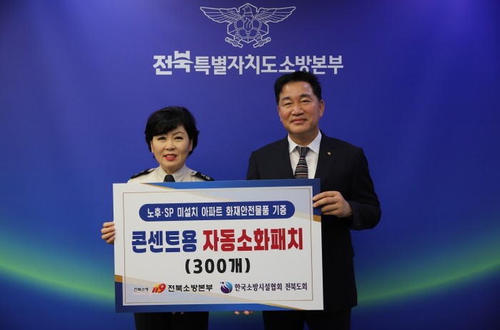 [파이낸셜경제=김예빈 기자] 전북특별자치도소방본부는 28일 오전 10시 도청 소방본부장실에서 한국소방시설협회 전북도회(회장 백부현)와 함께 콘센트용 소화패치 기증식을 개최하고, 도내 노후 아파트 화재예방을 위한 부착형 예방물품 300개(280만원 상당)를 지원받았다고 밝혔다.